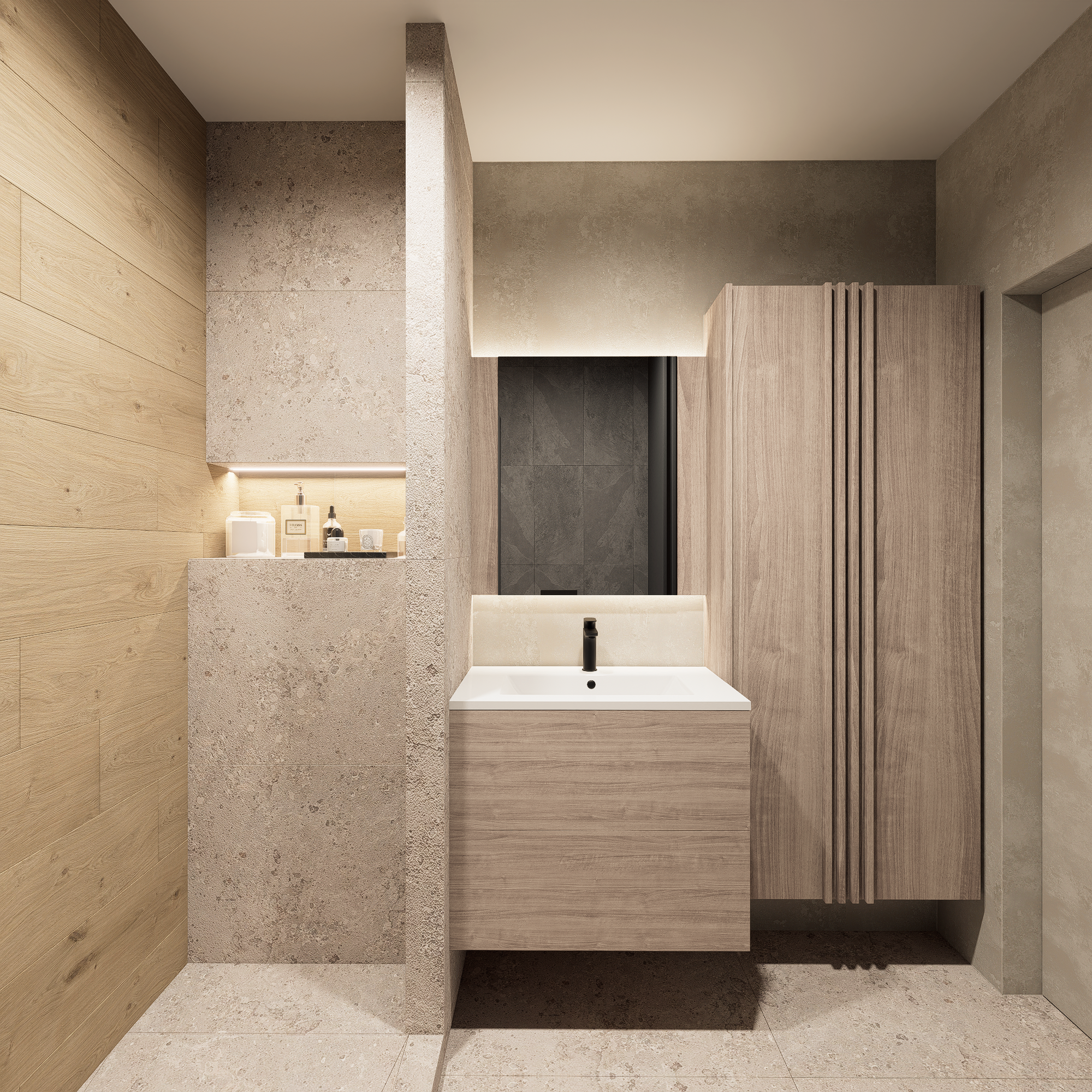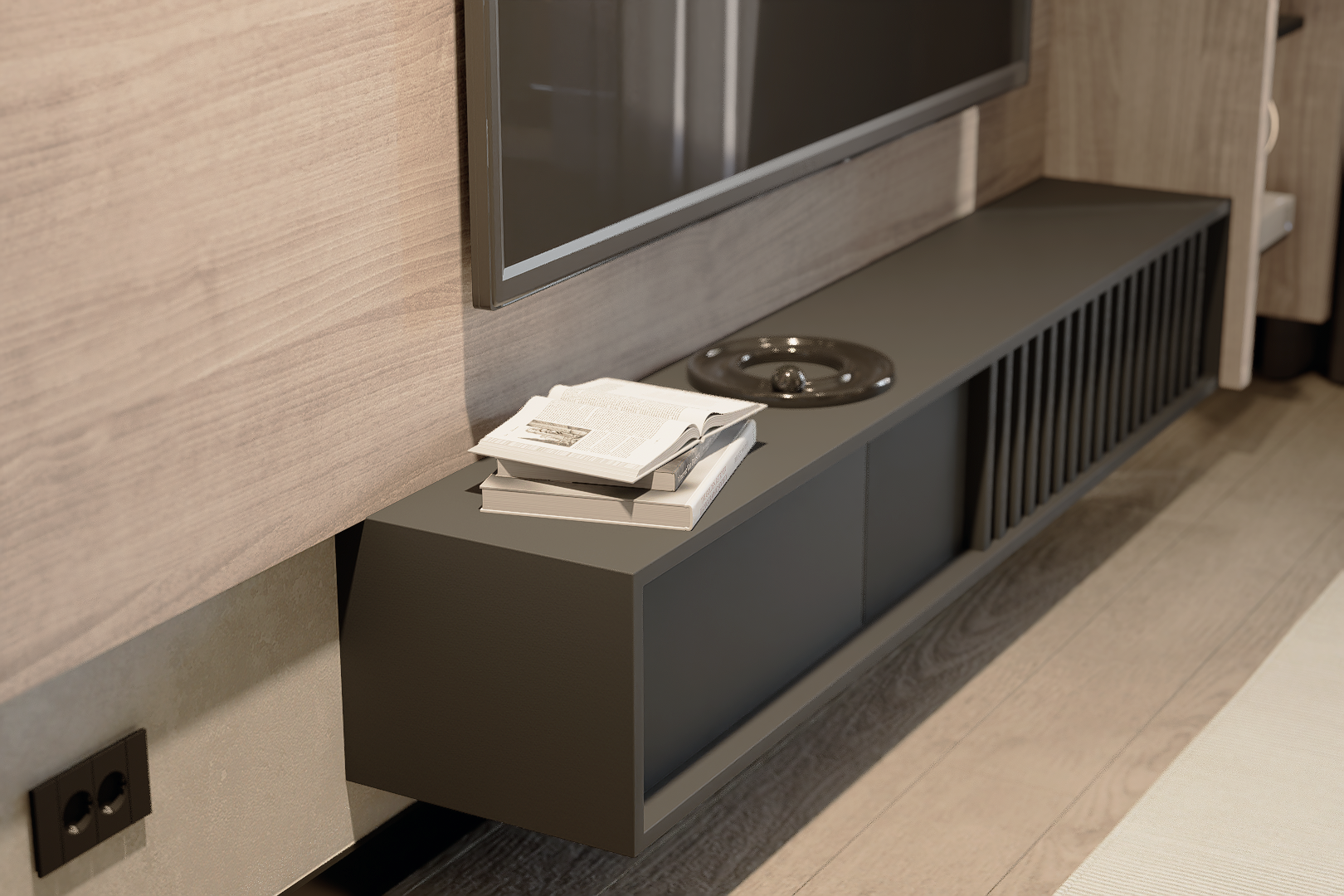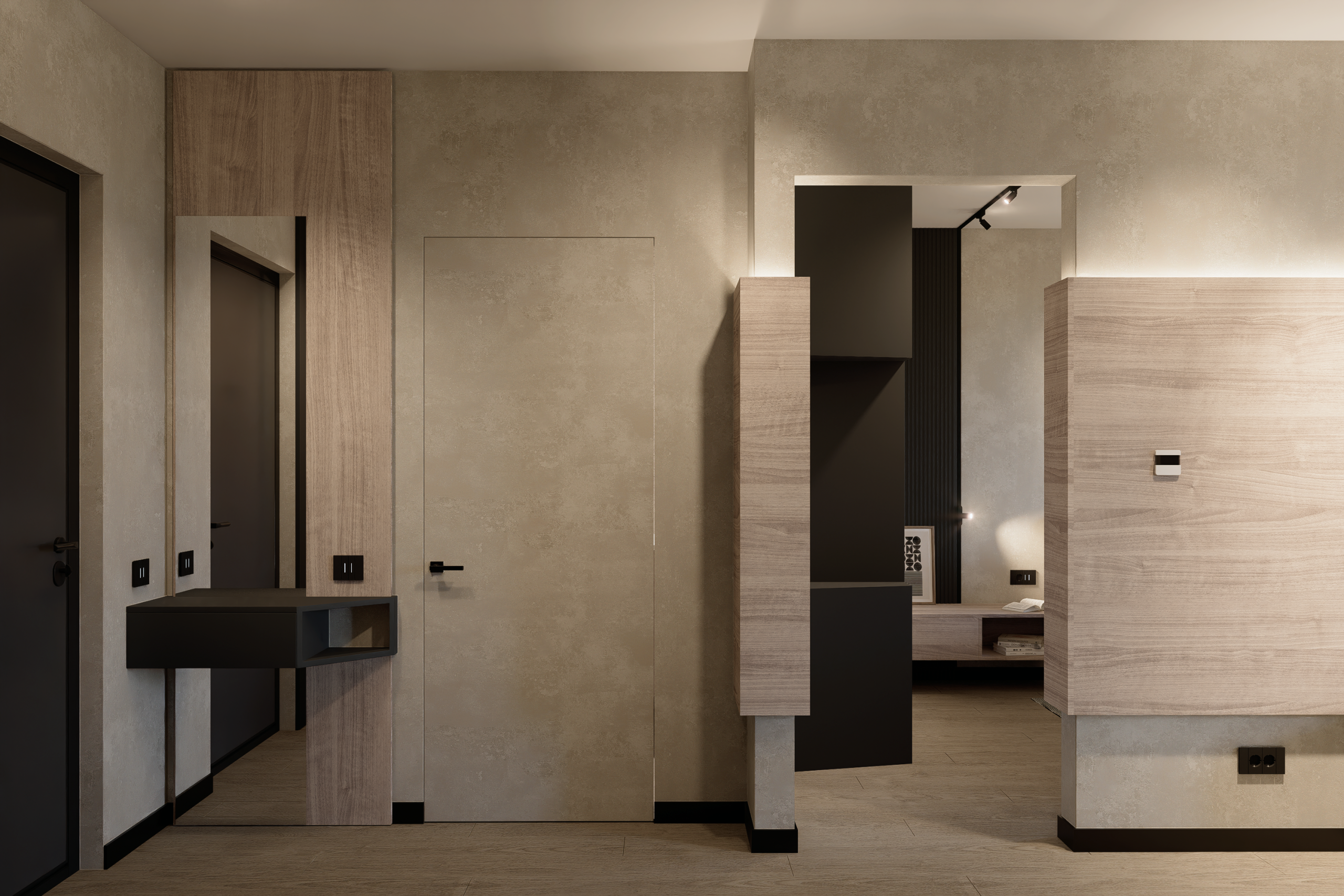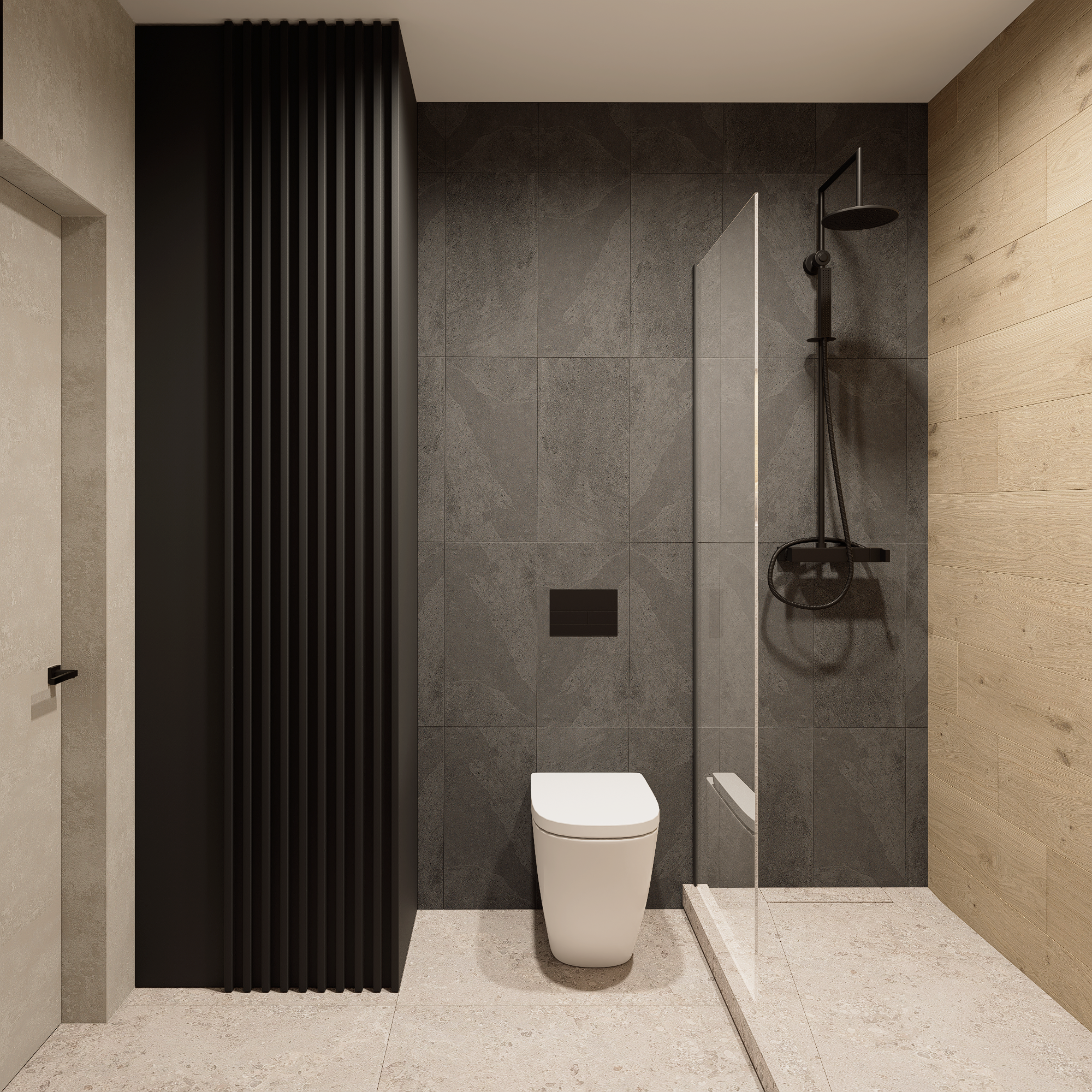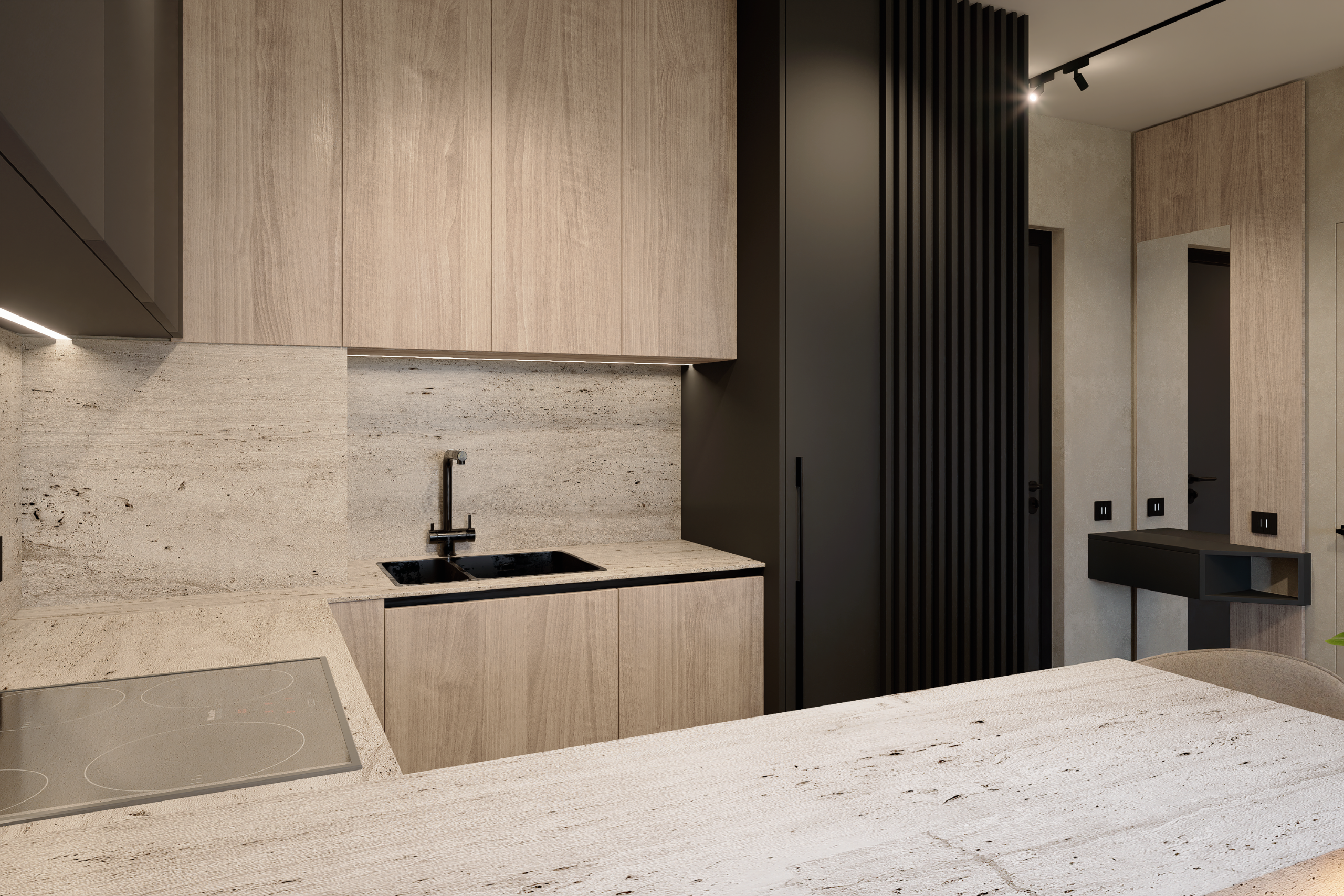 Dialogul Texturilor: Am echilibrat „recele” antracitului cu „căldura” organică a riflajelor de lemn. Este un balans psihologic între forța masculină și senzația de „acasă”.