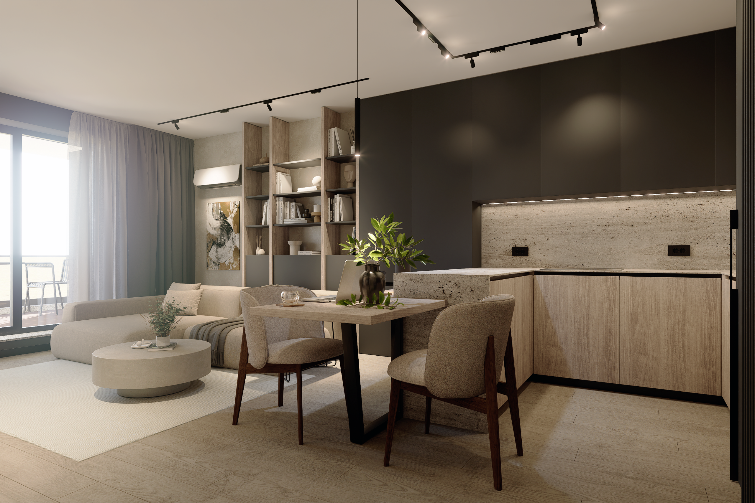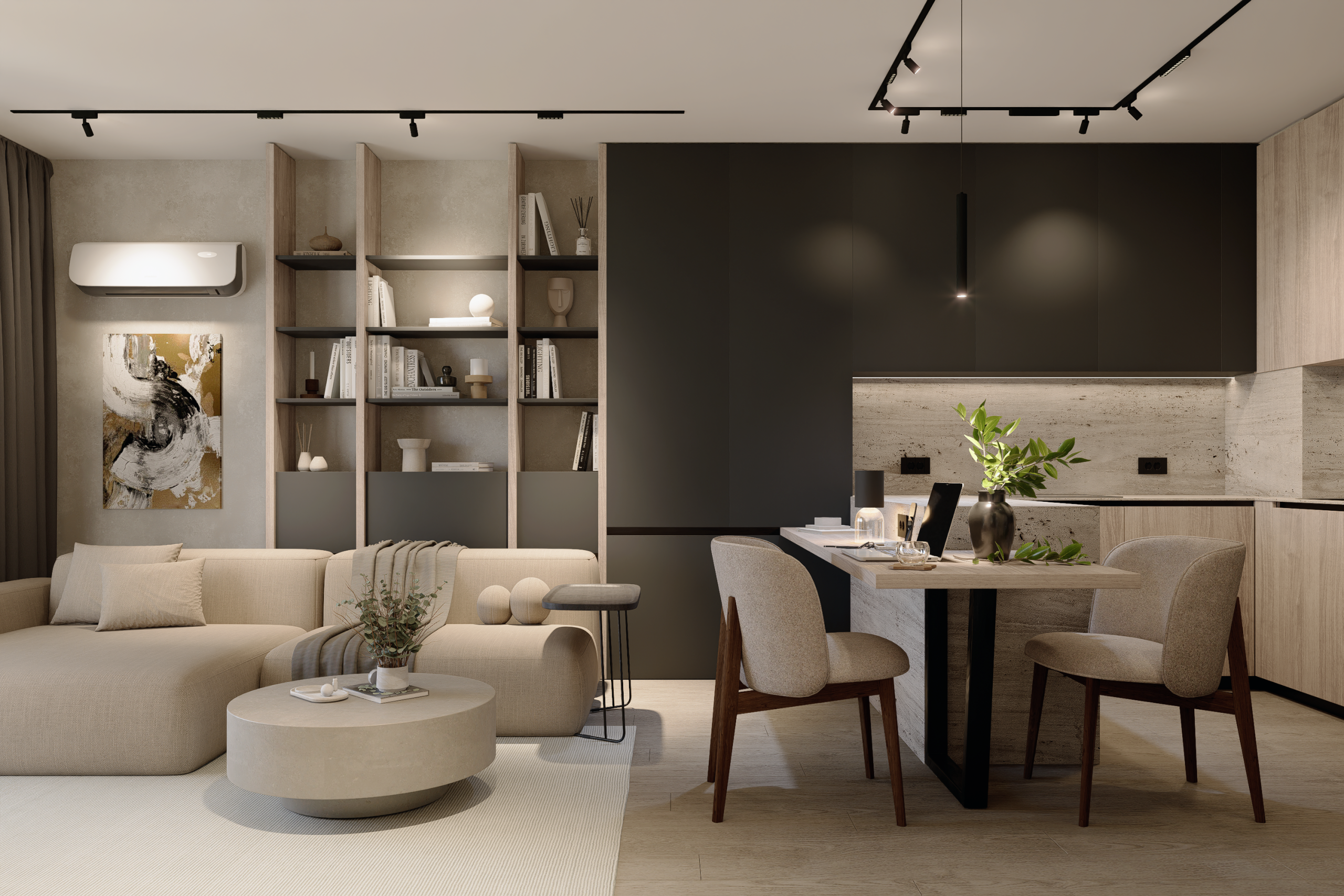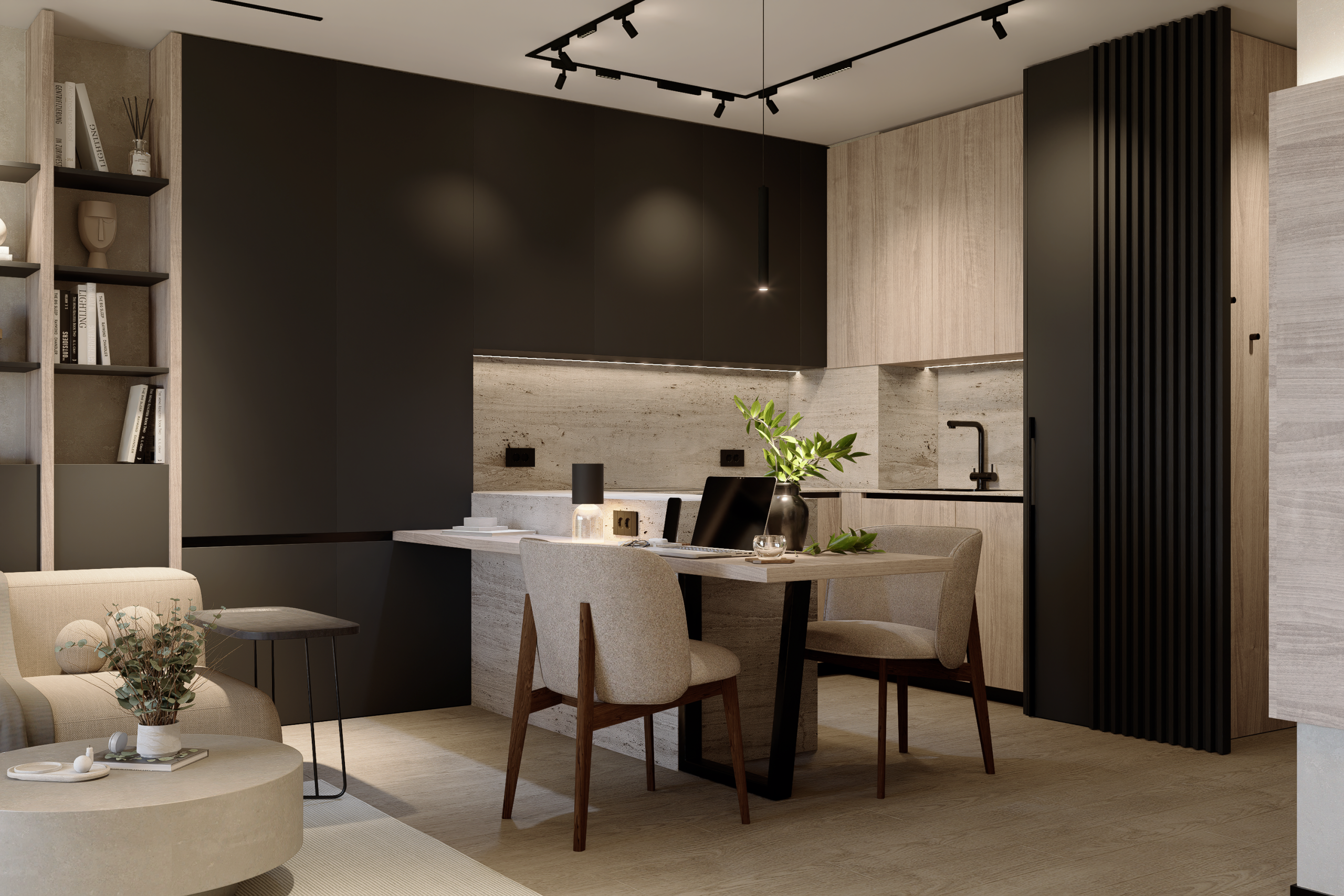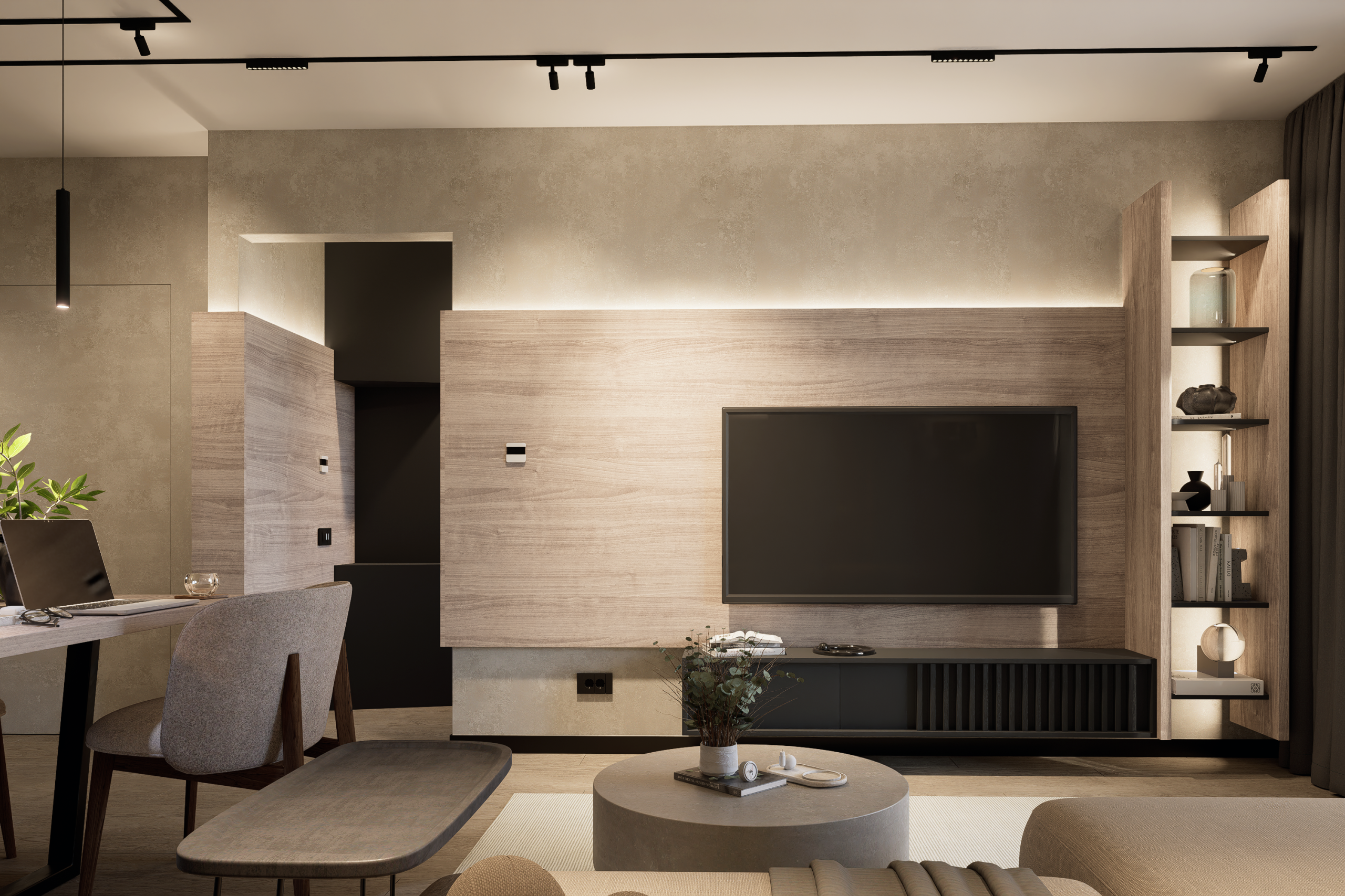 Arhitectura Luminii: Am folosit sisteme pe șină și benzi LED integrate pentru a sculpta volumele. Lumina nu doar luminează; ea creează zone de focus și intimitate, transformând atmosfera în funcție de momentul zilei.