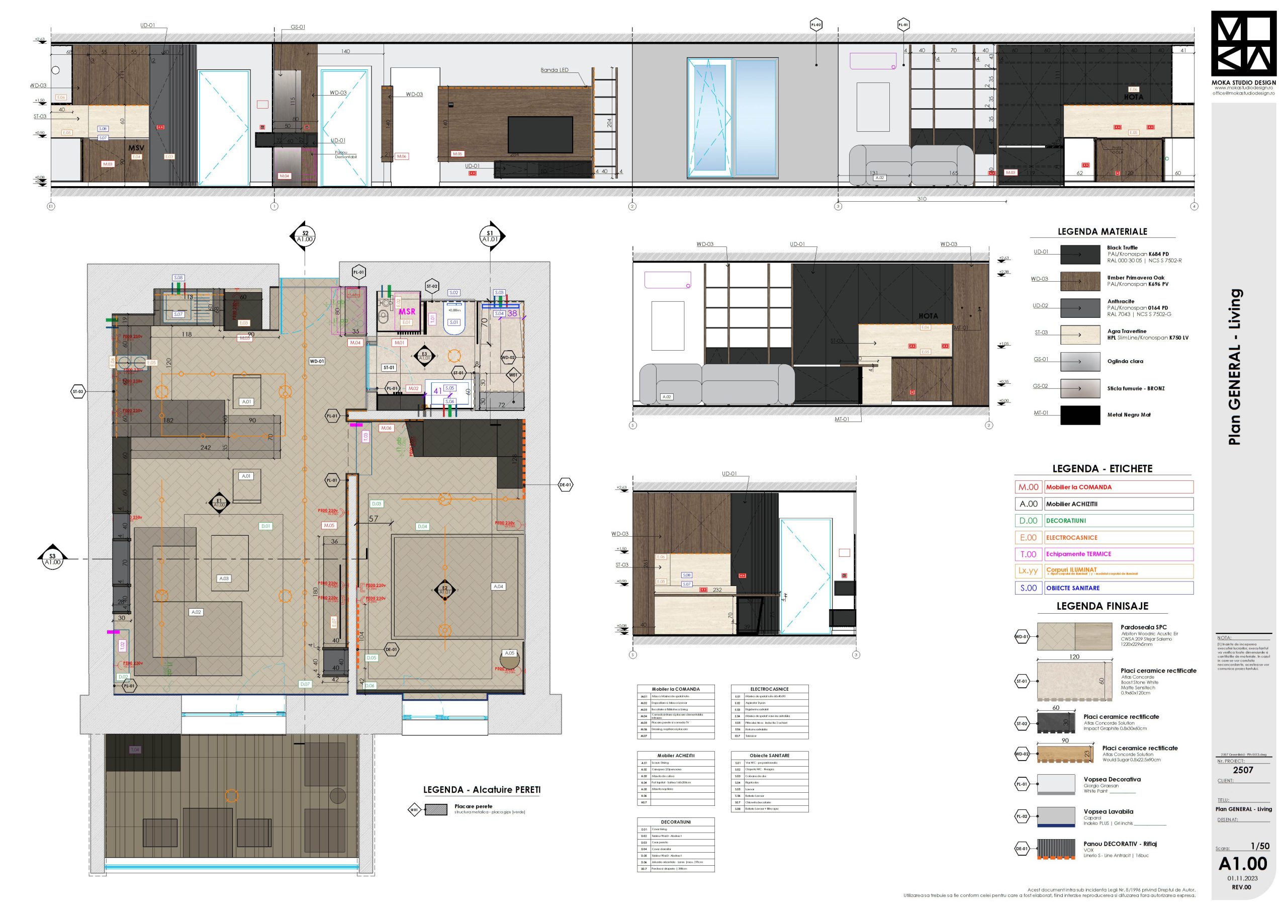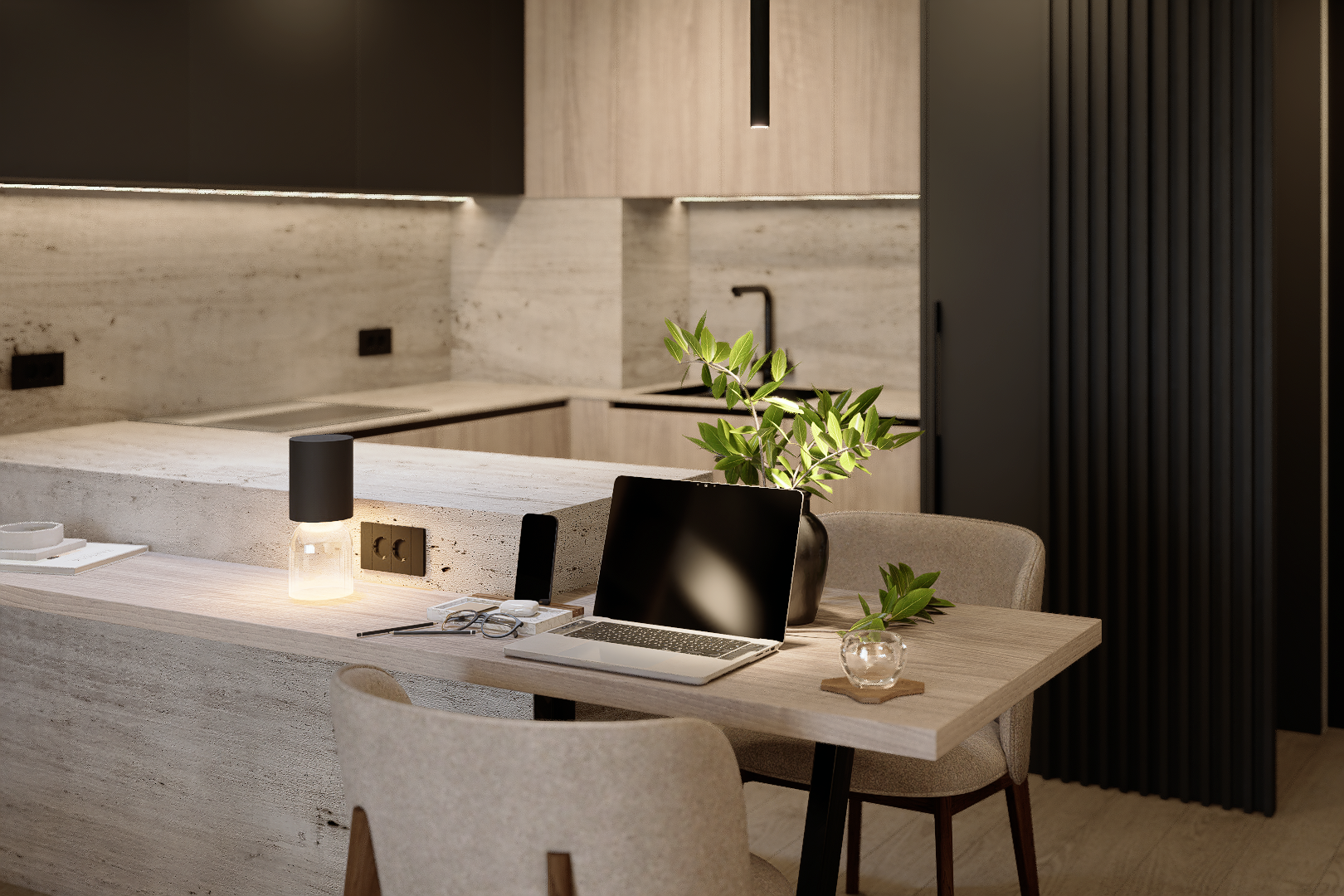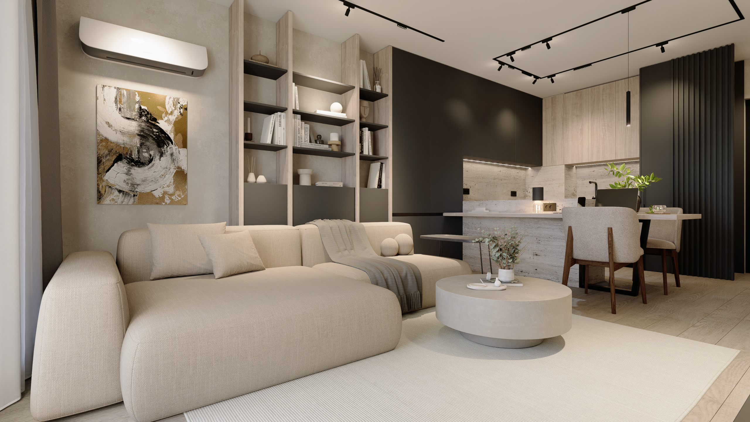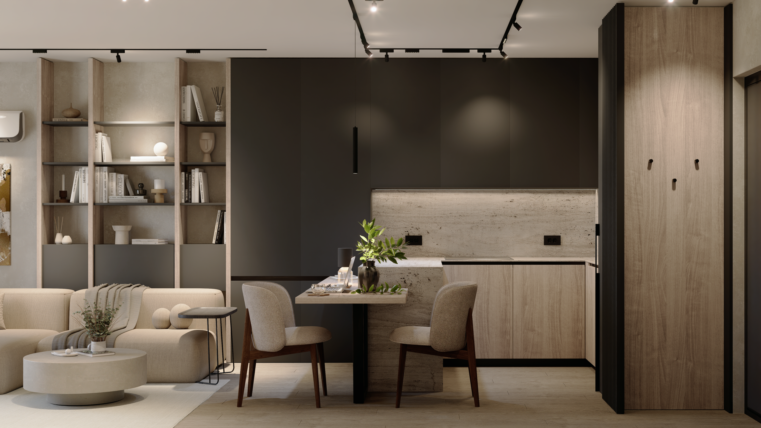 Arhitectura Luminii: Am folosit sisteme pe șină și benzi LED integrate pentru a sculpta volumele. Lumina nu doar luminează; ea creează zone de focus și intimitate, transformând atmosfera în funcție de momentul zilei.