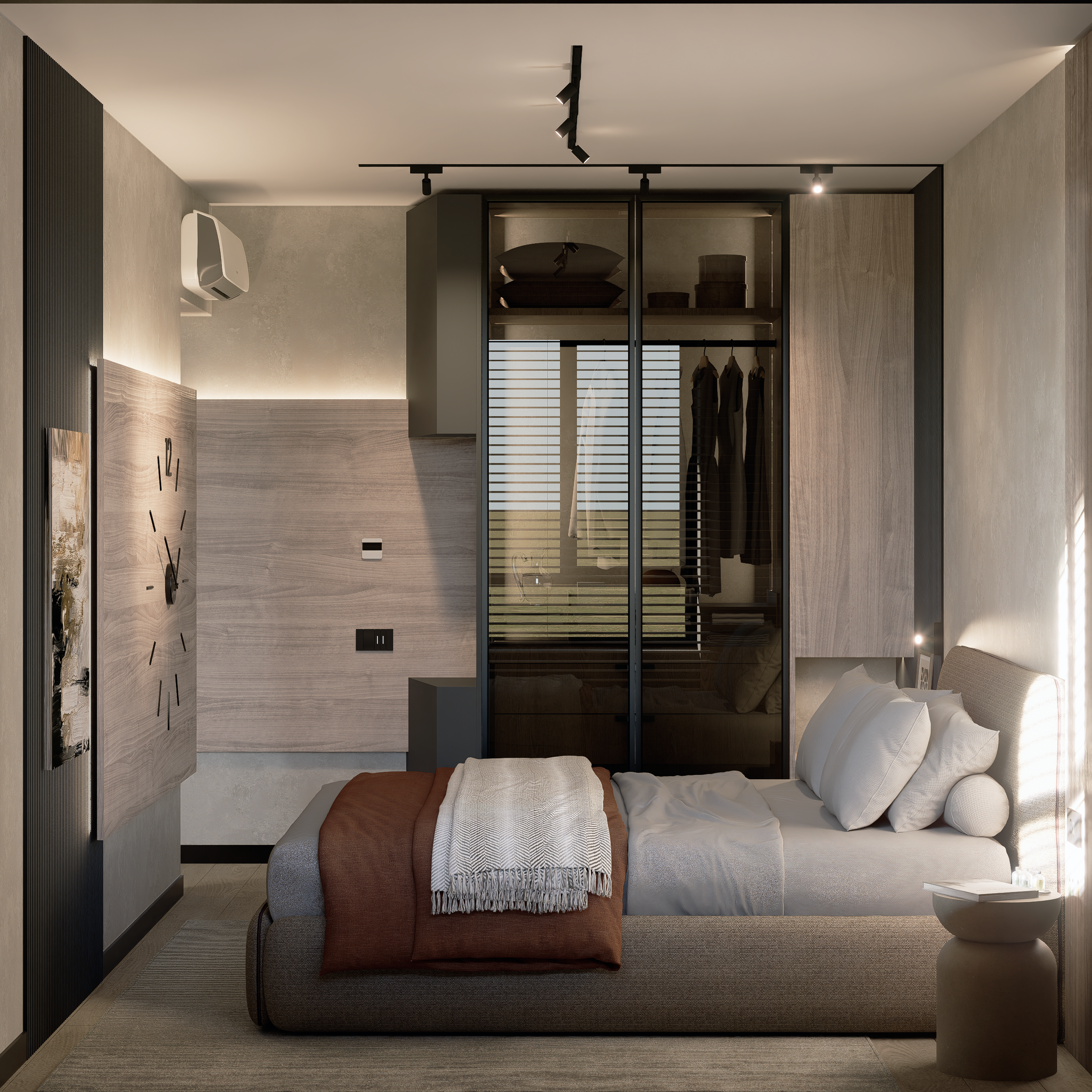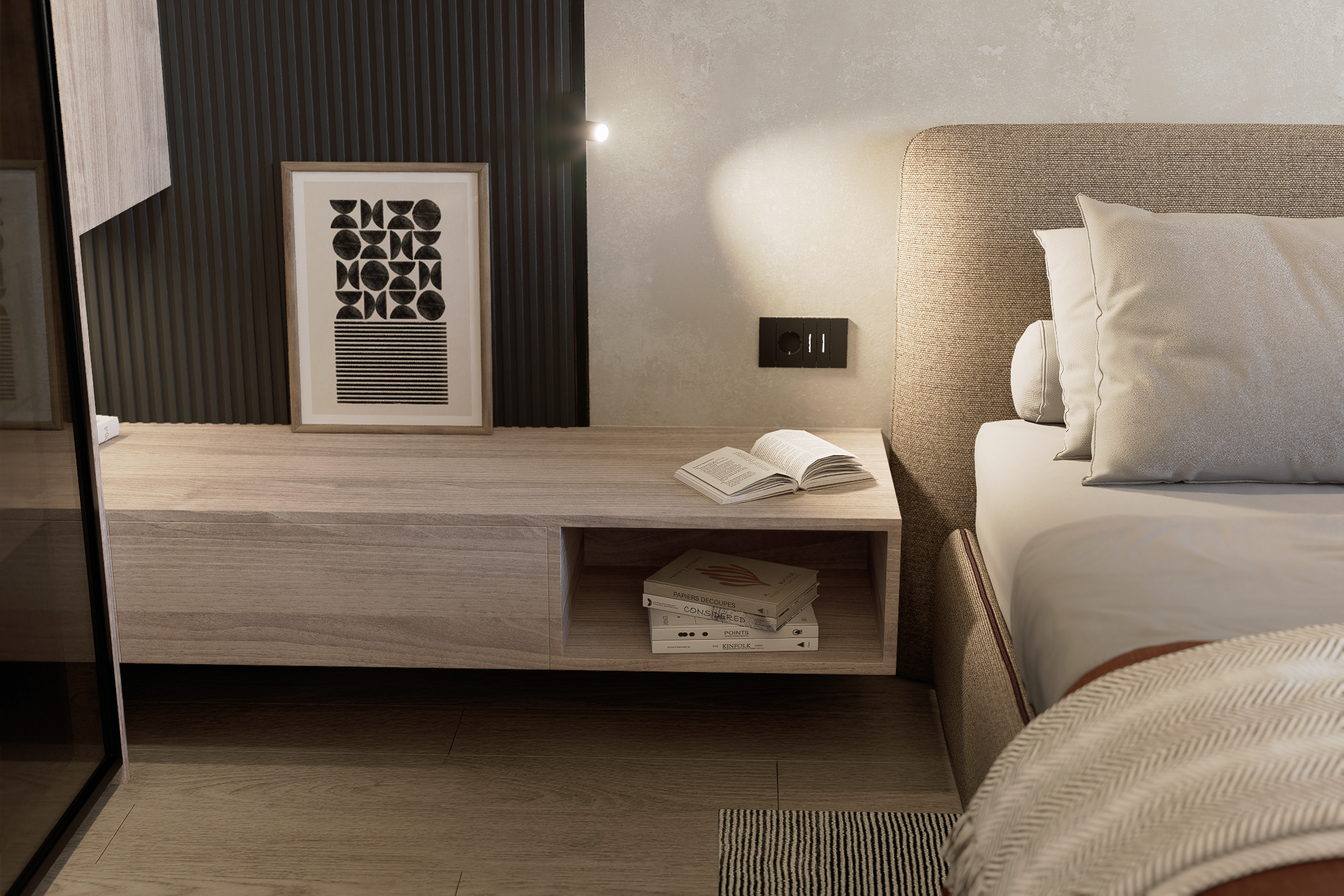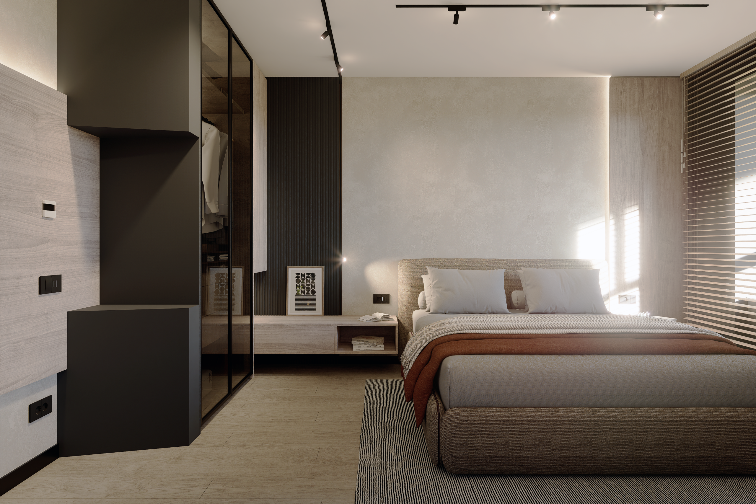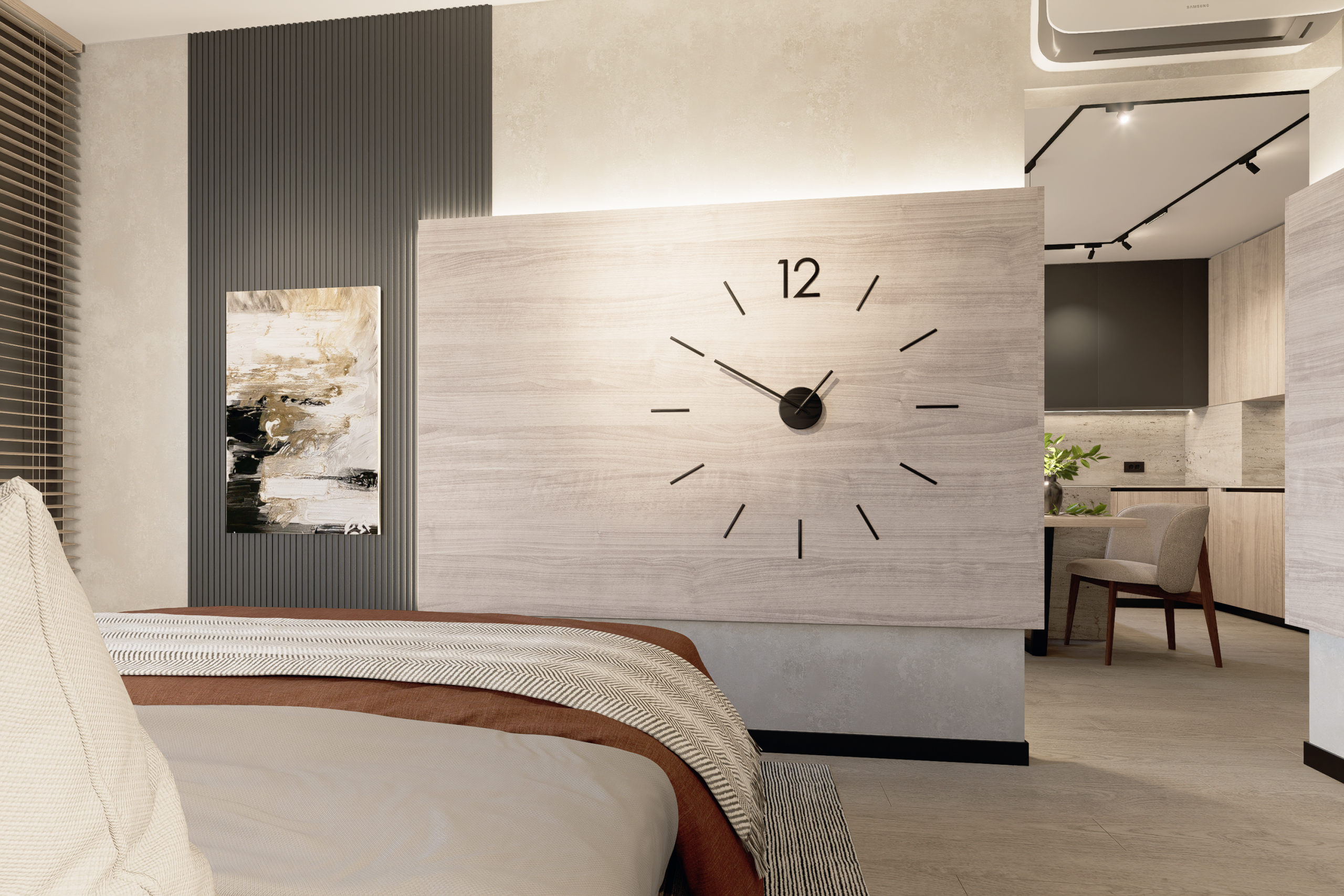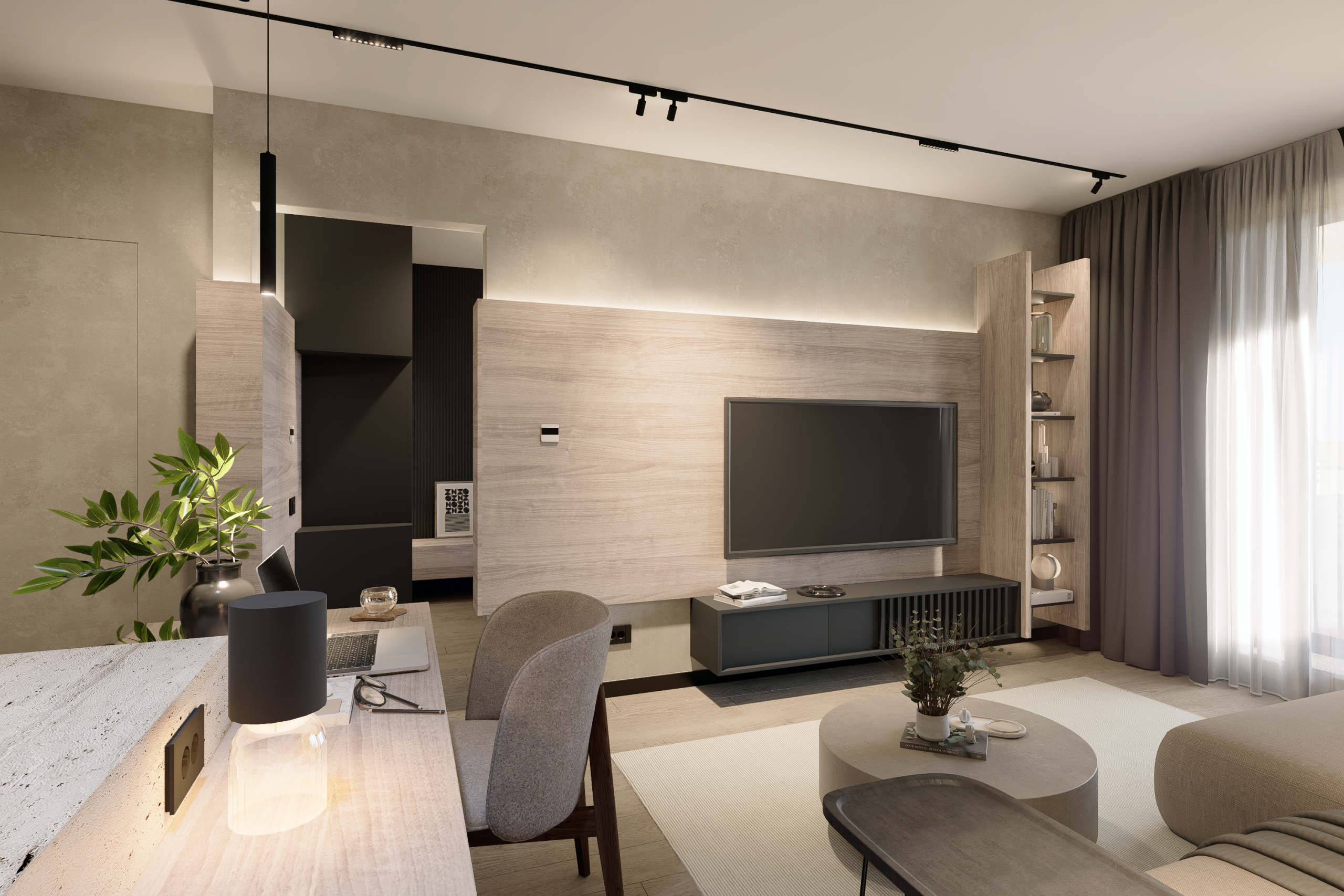 Productivitate Integrată: Într-o eră a muncii hibride, am creat un workspace discret în zona de zi, fără a fragmenta unitatea vizuală a camerei.