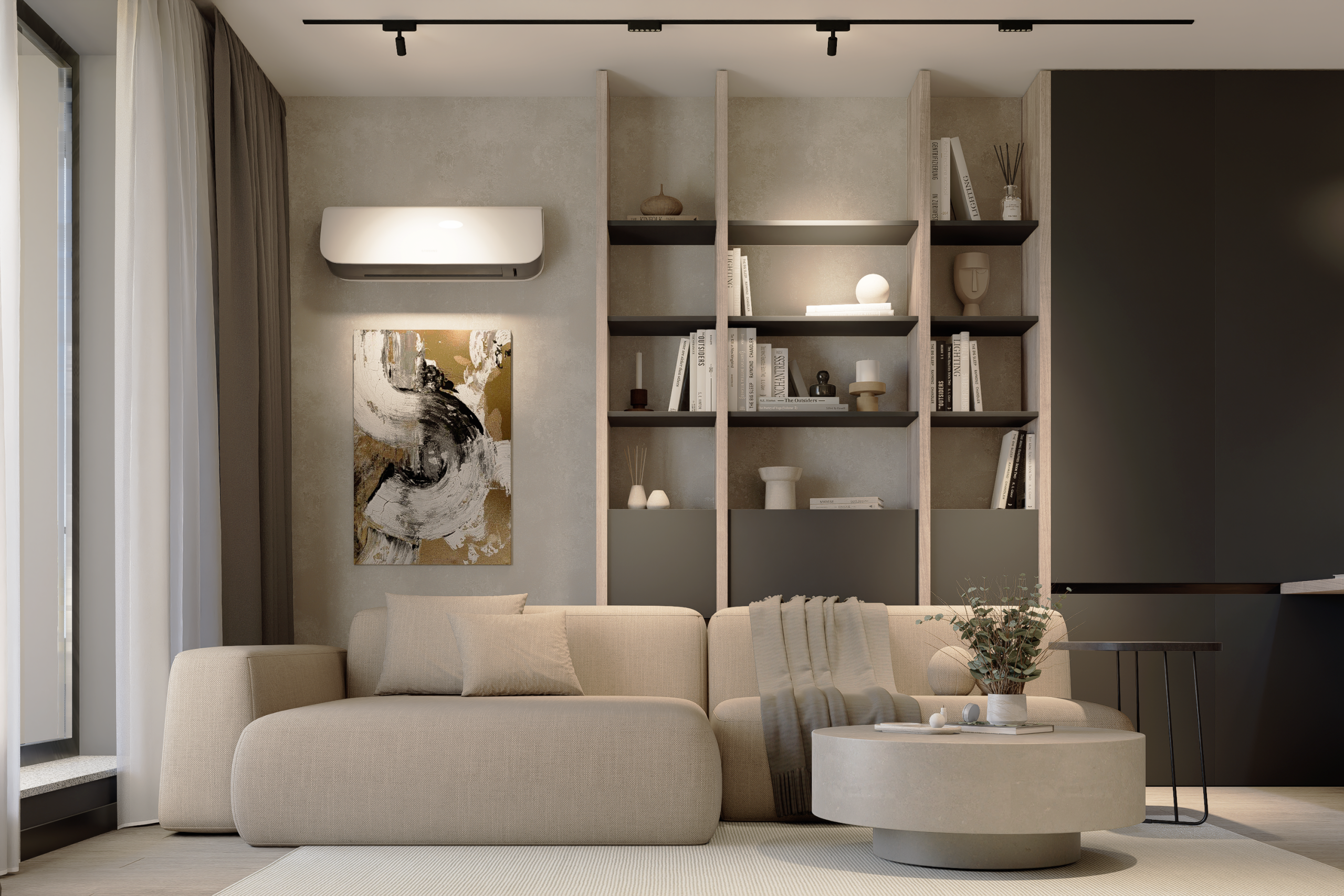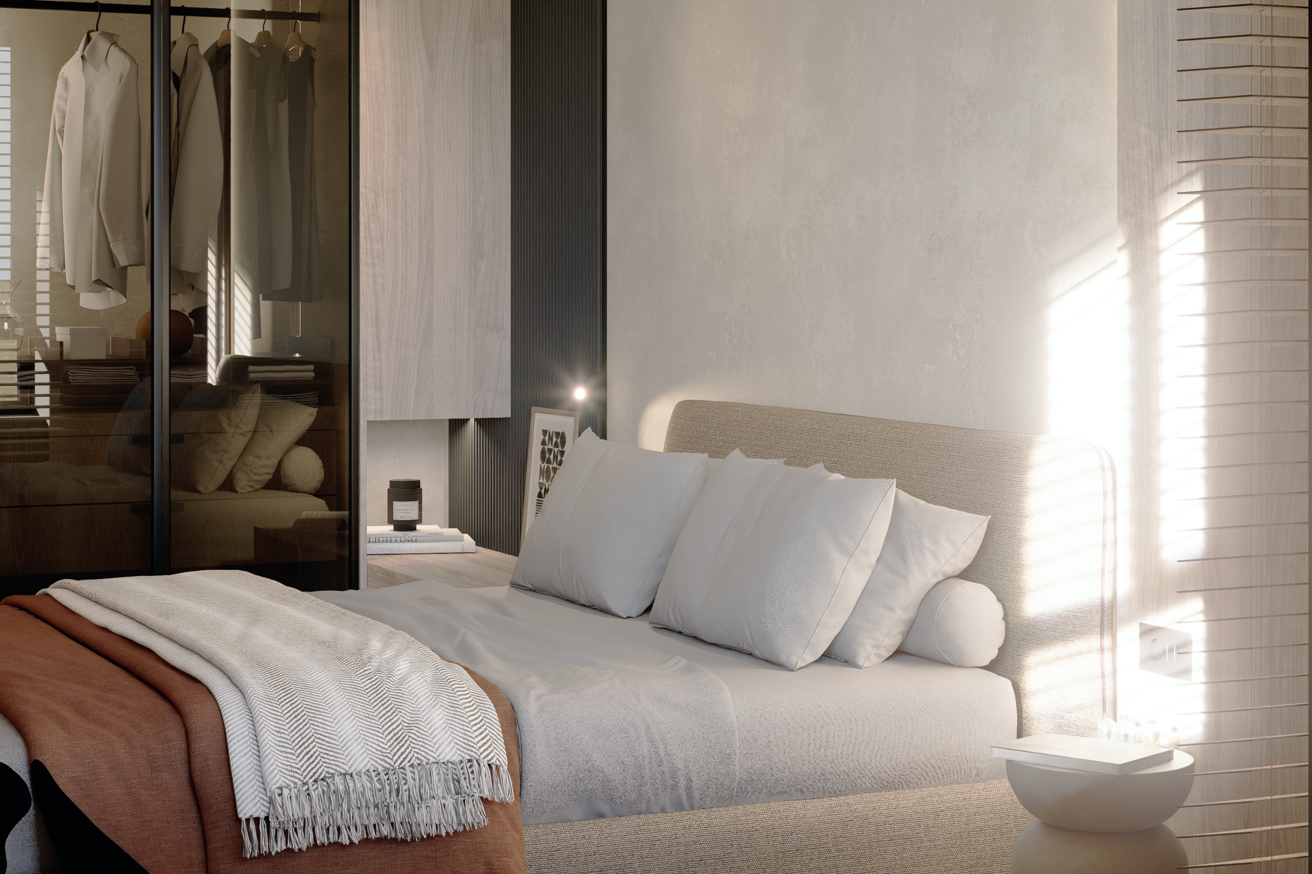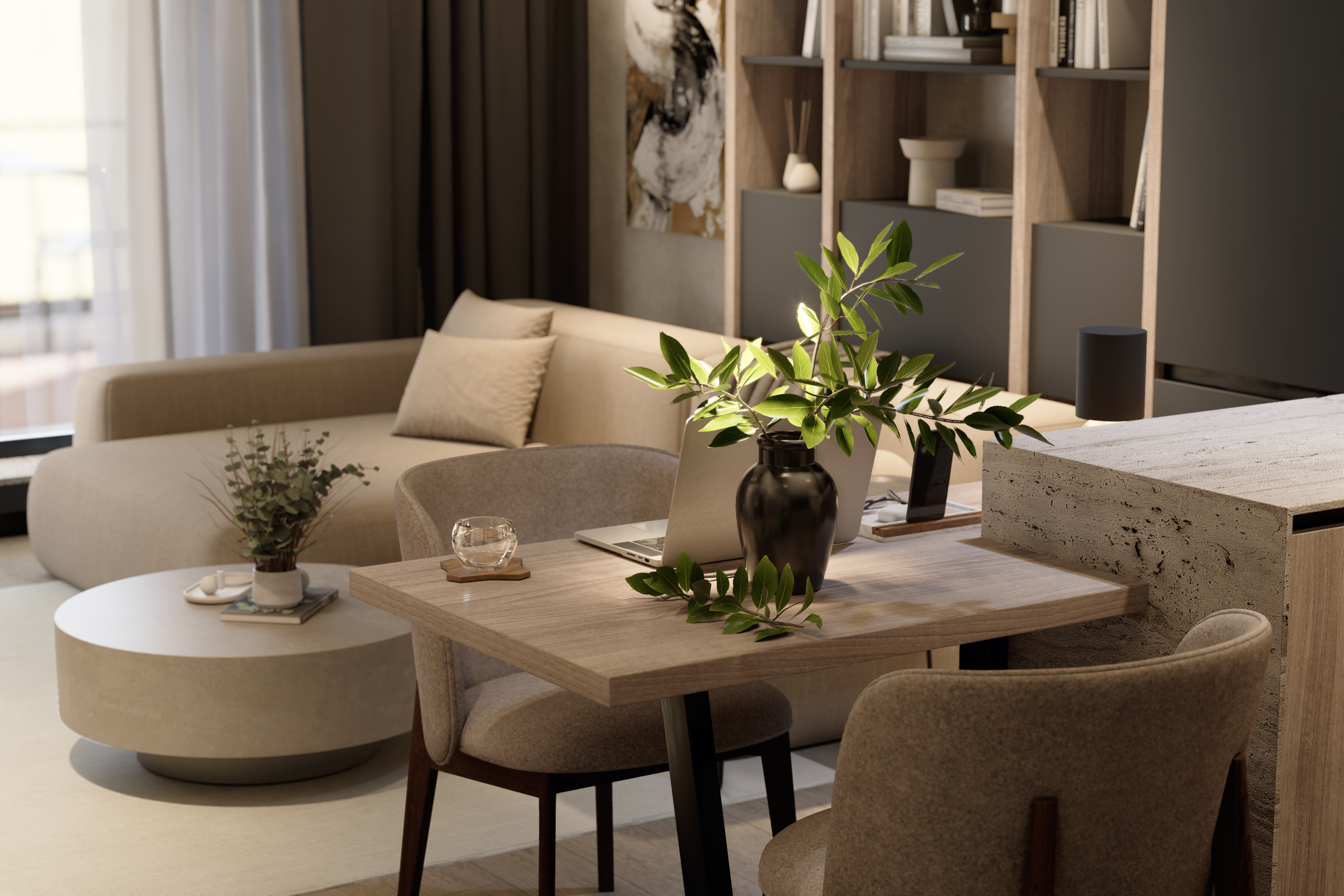 Ordinea Mentală: Depozitarea este mascată prin volume mari, integrate cromatic în pereți. Un spațiu neîncărcat vizual facilitează o minte clară și concentrată.