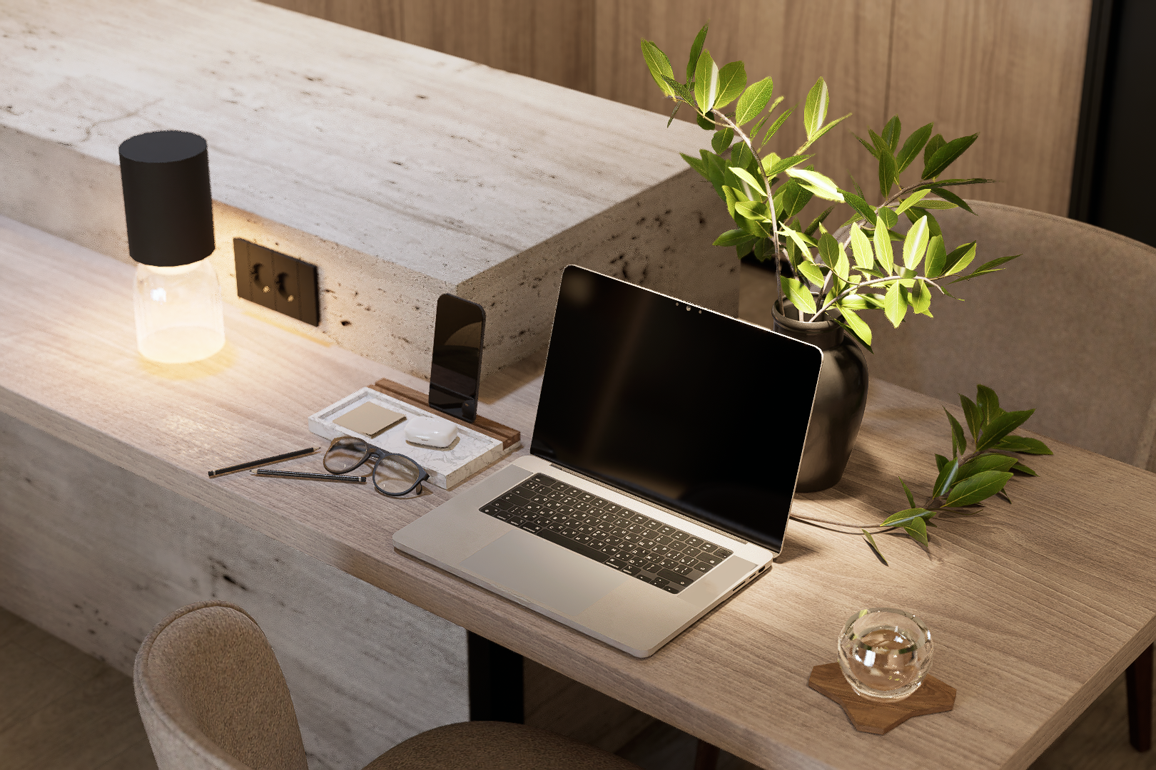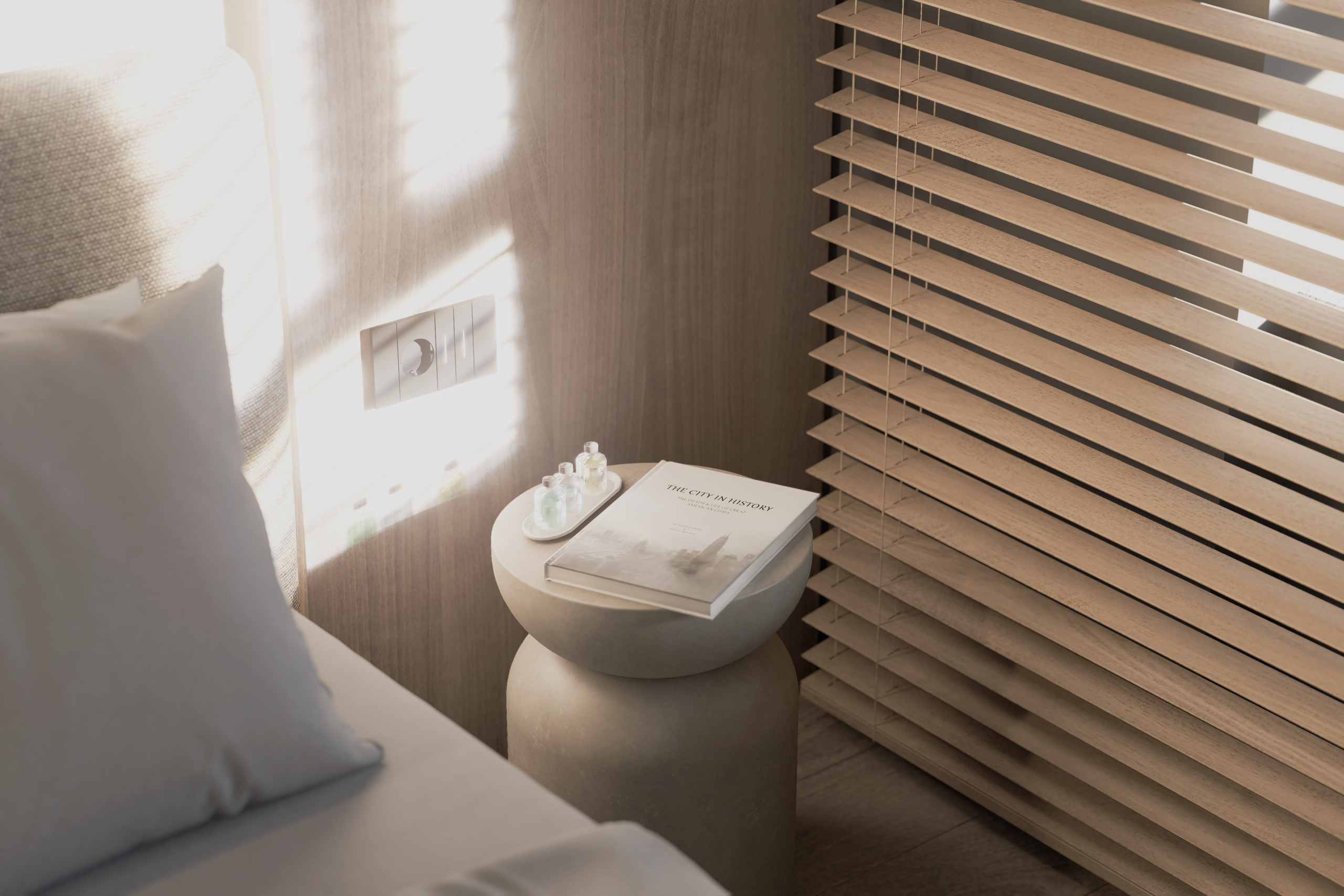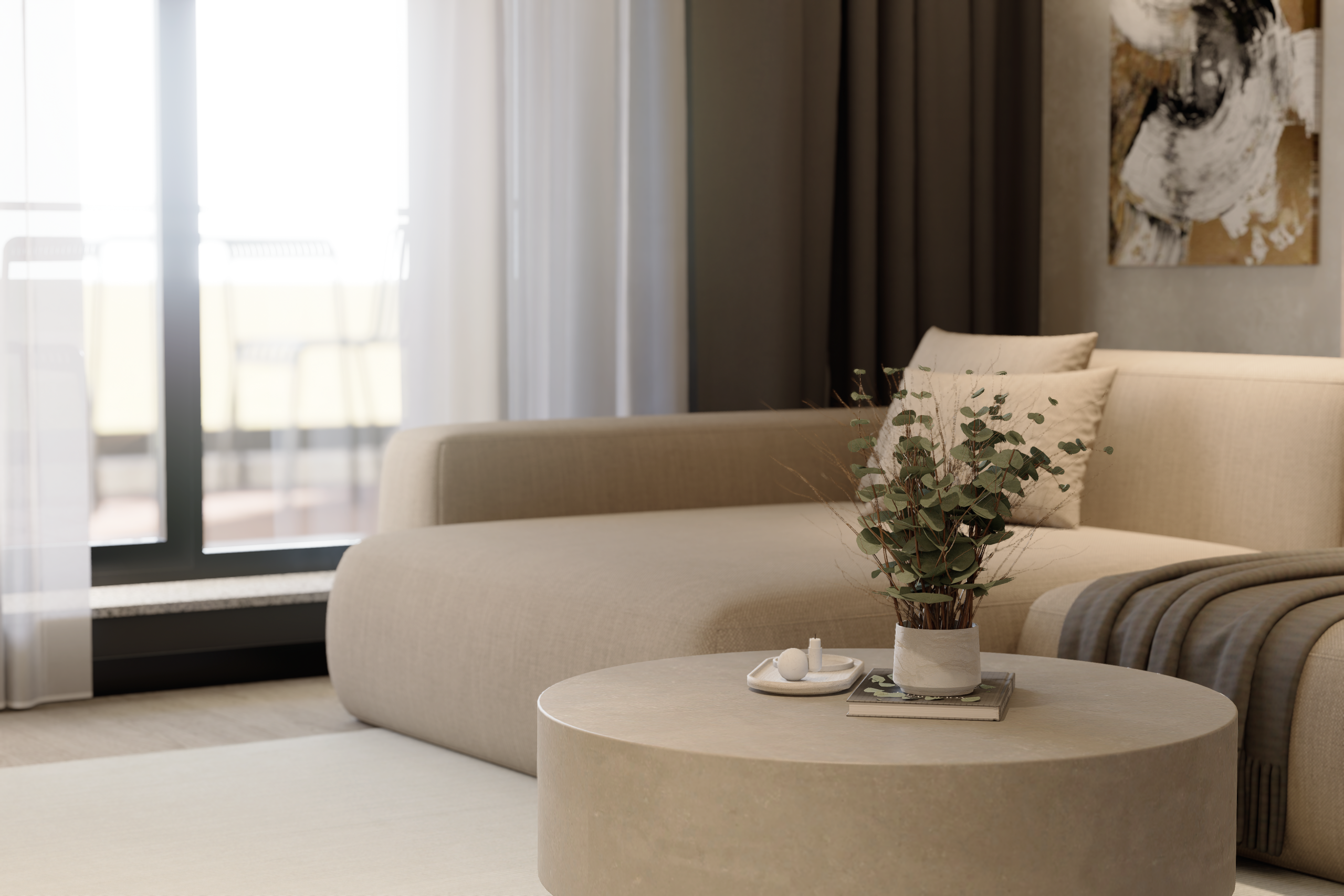 Ordinea Mentală: Depozitarea este mascată prin volume mari, integrate cromatic în pereți. Un spațiu neîncărcat vizual facilitează o minte clară și concentrată.