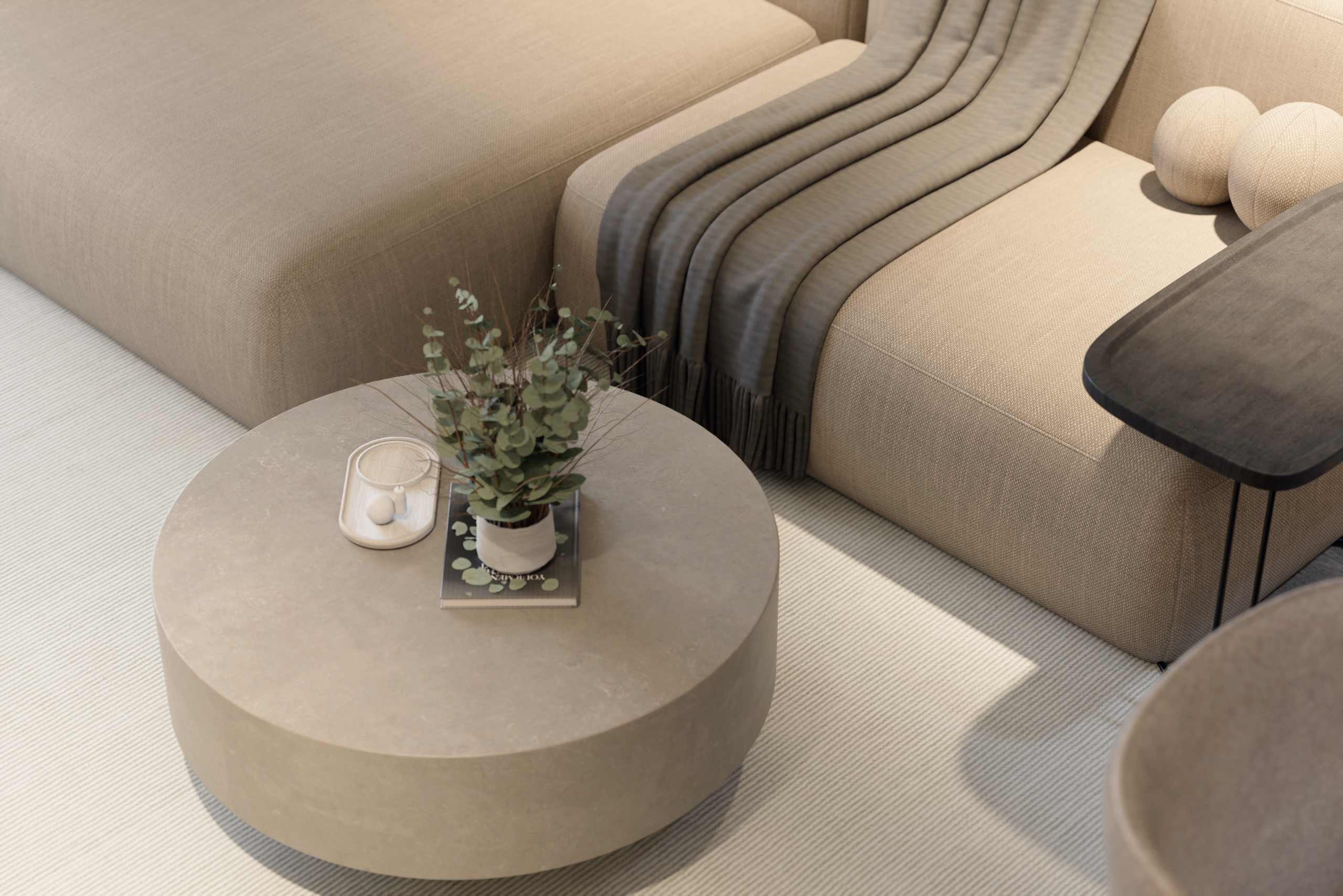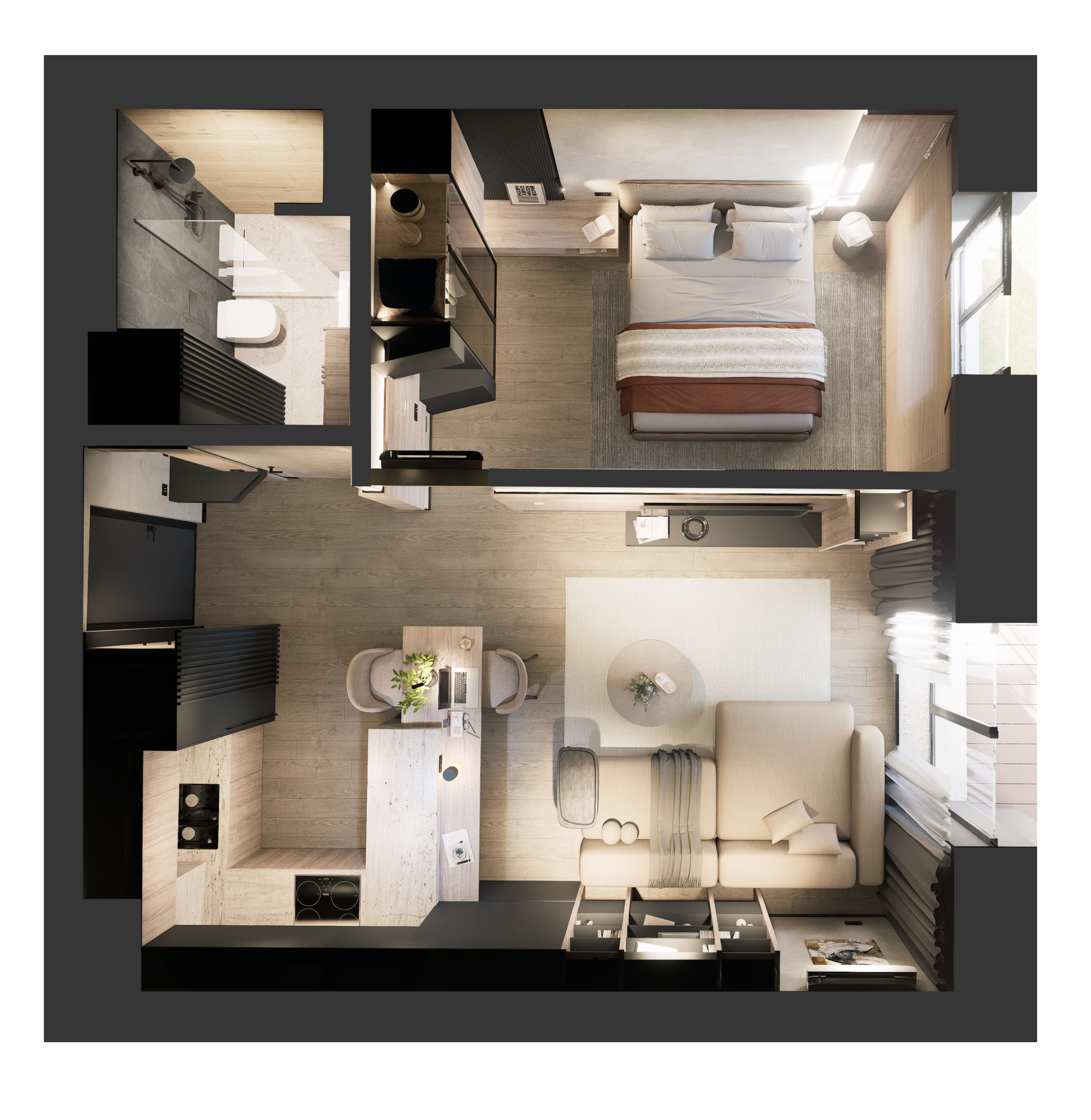 Numele proiectului derivă din materialul care îi dictează caracterul: grafitul. Asemenea lui, spațiul este definit de rezistență și o paletă cromatică profundă. Stilul este o fuziune de minimalism modern cu accente industriale, o estetică „Soft Industrial” care elimină zgomotul vizual pentru a lăsa loc esențialului.